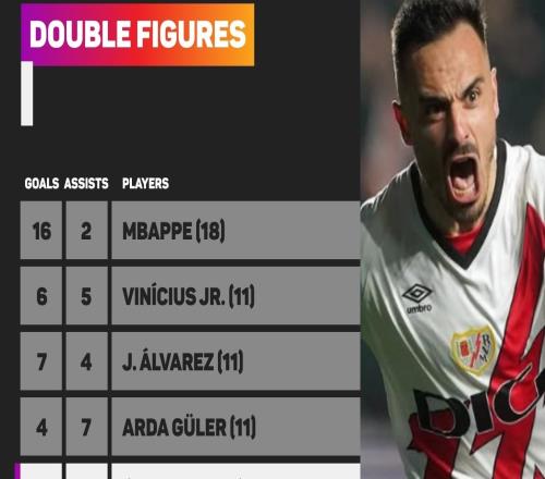 • 阿尔瓦罗加西亚是本赛季五大联赛首位制造进球上双的西班牙球员