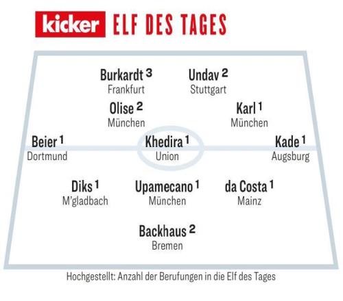 德媒《踢球者》评选德甲第11轮最佳阵容,卡尔、奥利塞、于帕梅卡诺、拜尔入选。守门员:巴克豪斯(不莱梅)后卫:迪...
