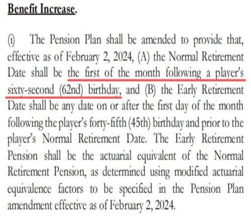 NBA劳资协议条款里明确指出:正常退休日期应为球员62岁生日后的第一个月的第一天;但同样可以选择从45岁生日次月的第一天到正常退休日期前的任意一天。早领早受益,但同时每月领取的金额会按规定系数削减,晚领晚受益,相应的正常退休再领,每月可以领取全额,联盟自然是鼓励球员从正常退休日期开始领。
