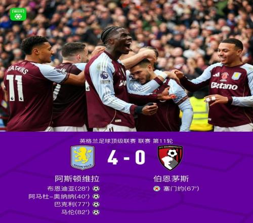 北京时间11月9日22:00,英超第11轮,阿斯顿维拉坐镇主场迎战伯恩茅斯。比赛中,布恩迪亚任意球破门,随后阿马杜-奥纳纳远射再下一城;下半场,塞门约主罚点球被大马丁扑出,巴克利、马伦先后取得进球。最终,阿斯顿维拉以4-0战胜伯恩茅斯。